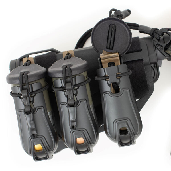 The SAP utilizes the patented 40mm grenade pouch developed and manufactured in collaboration between BlackPoint Tactical and RE Factor. This pouch was designed to carry everything from less lethal to HE munitions. It's adjustability offers secure, adaptable retention for multiple munition types. It offers dual retention options, one retention point on the rim casing of the round while the secondary retention point in an over the top bungee which further secured the round in the pouch. The over-the-top bungee offers two options, the standard nylon bungee or an upgraded option with cover cap which further protects the rim and primer of the round preventing damage while the round and system are being stored.  The secondary bungee is easily removeable so the operator can easily switch between single or dual retention options based on mission need and/or unit policy.