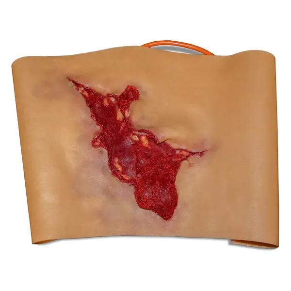 A wearable wound simulation that represents a severe avulsion with torn flesh to the calf exposing fat and muscle. It wraps around an actor or manikin and attaches with hook and loop fastening. Blood tubing is integrated into the construction to easily create simulated blood flow. The PATENTED construction with SOFTTECH materials, provides realism for your training scenario.