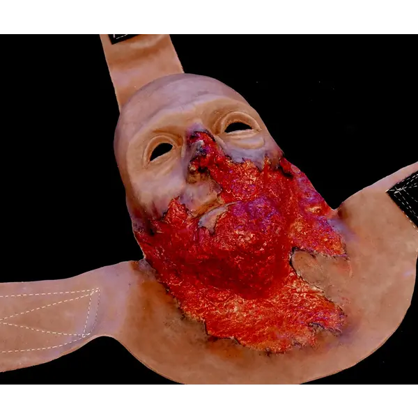 A wearable wound simulation that represents a face with third-degree burns. It wraps around an actor or manikin and attaches with hook and loop fastening to give the realistic appearance of a face with third-degree burns. The PATENTED construction with SOFTTECH materials, provides realism for your training scenario.