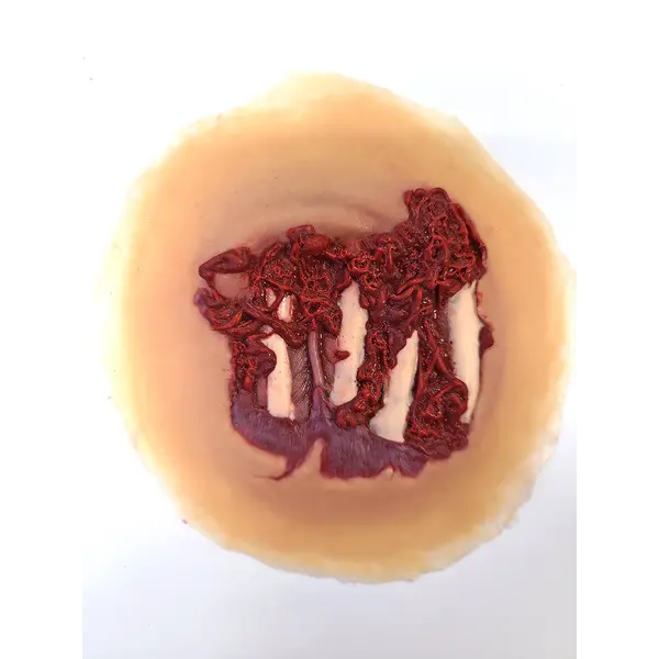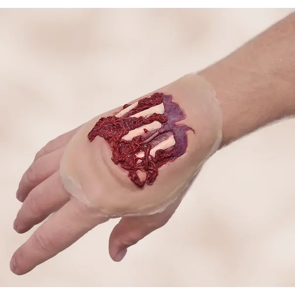 Degloved Hand injury - Self Adhesive. Wounds can be reused multiple times. If the wound becomes dirty simply wash it with warm soap and water to "reactivate" the self-adhesive backing. No need for makeup glue.