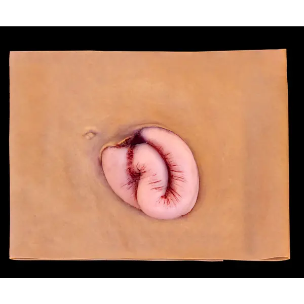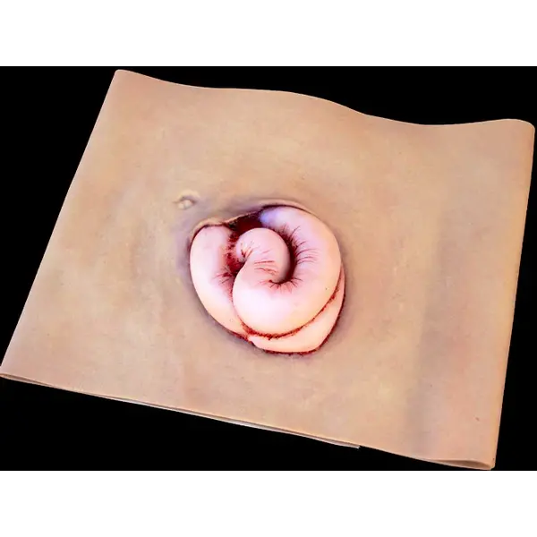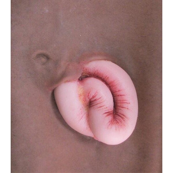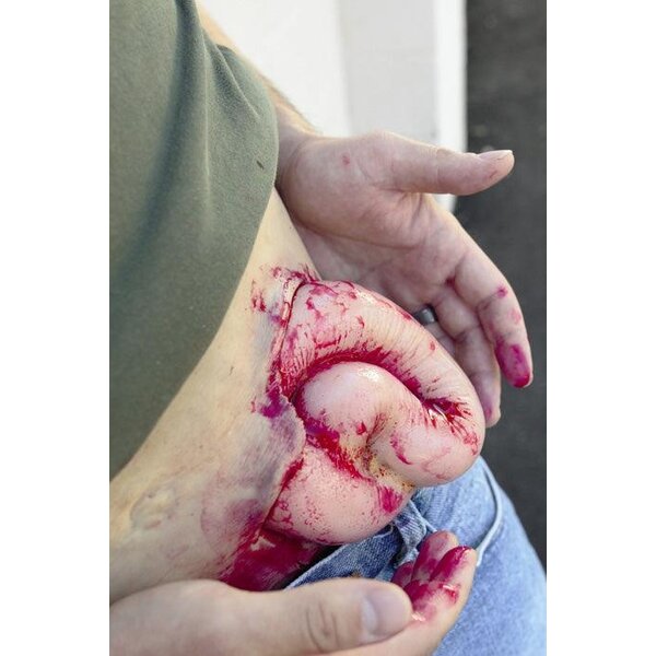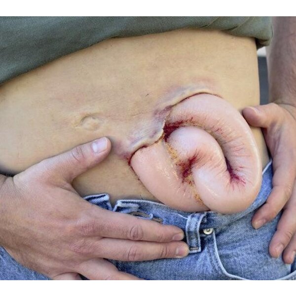 A wearable wound simulation that represents a deep laceration with exposed bowel and fat tissue. The representative skin and tissue of the WW3-005 is constructed of high-quality silicone rubber, with layers of coloration that provide depth and realism to the product. The PATENTED construction with SOFTTECH materials delivers a lifelike feel yet remains durable and UV resistant. Blood tubing is integrated into the construction to easily create simulated blood flow. It wraps around an actor or manikin and attaches with hook and loop fastening.