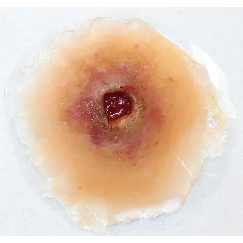 GS Entry Wound- Small - Self-adhesive. Wounds can be reused multiple times. If the wound becomes dirty simply wash with warm soap and water to "reactivate" the self-adhesive backing. No need for makeup glue.