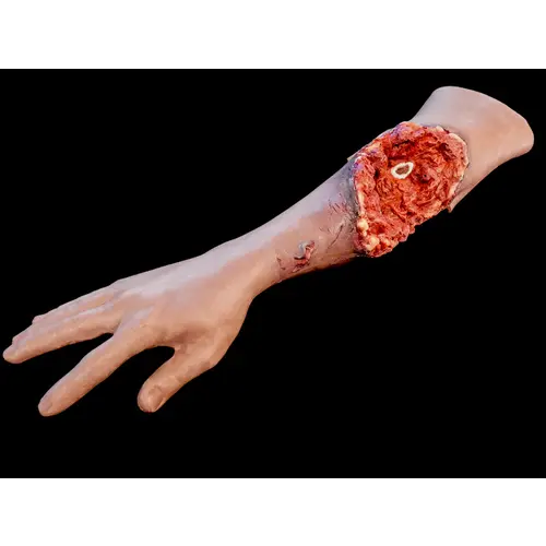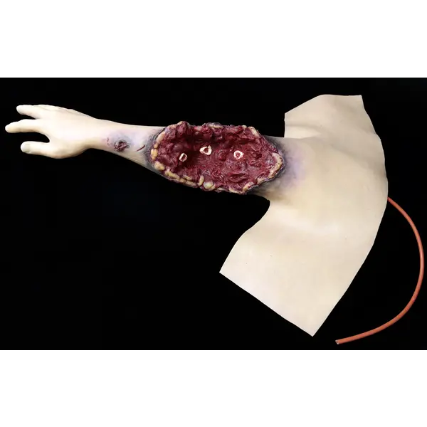 A wearable wound simulation that represents a partial arm amputation on the right arm. The simulation shows deep laceration exposing bone, muscle tissue, fat, and tendons. It wraps around the actor or manikin bicep and attaches with hook and loop fastening. The wound is a realistic weight to allow for the most convincing simulation possible. Blood tubing is integrated into the construction to easily create simulated blood flow. The WW3-051 operates with the included WW3-BRP Blood Supply Pump and is also compatible with SKEDCO brand bleeding simulation equipment.