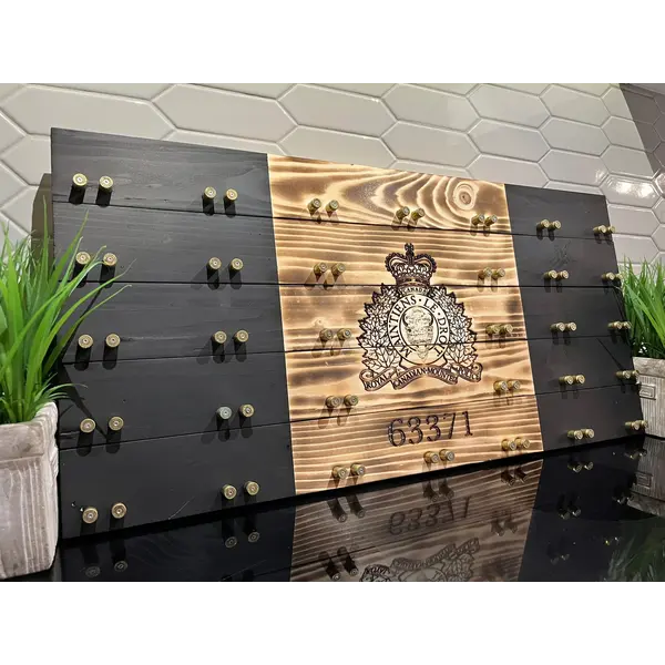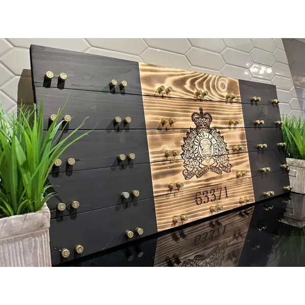 This 32 coin rustic police crested challenge coin display case is perfect for those wishing to showcase their challenge coins on this beautiful display. Crafted from freshly cut poplar and finished with 9mm bullet casings.