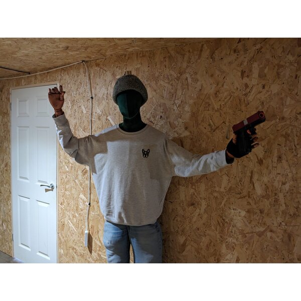 Suitable for all of simunition the target comprises of an anti ricochet torso with sacrificial wooden arms and hands and soft material legs. There is no metal in the target save for the magnet situate at the very crown of the head.