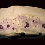 A wearable wound simulation that represents shrapnel hitting a full left arm. The device shows superficial shrapnel wounds. Bleeding system designed to ooze from multiple locations. It wraps around an actor or manikin and attaches with hook and loop fastening. Blood tubing is integrated into the construction to easily create simulated blood flow.