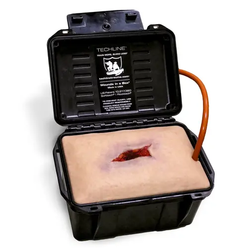 The Shrapnel Wound in a Box task trainer simulates a soft-tissue wound, is used to instruct students in proper wound packing technique. It features a hard bone (fractured) inside of the wound cavity to elevate skill level. The device can be connected to a SKEDCO FEBSS or manual bleeding system (bleeding systems not included), to provide simulated blood flow that responds to pressure when properly packed. The soft material and patented design provide a realistic feel and an enhanced training experience.