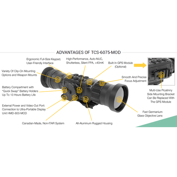 The TCS-6075-MOD is the professional-grade thermal clip-on sight for aiming and engagement designed to work seamlessly with a wide variety of firearms and daytime scopes. The TCS-6075-MOD is a plug-and-play unit, deployed in mere seconds with no zeroing needed. It is also a great tool for reconnaissance and tactical surveillance. The latest generation silent and Auto-NUC sensor is at the base of the TCS-6075-MOD. GSCI proprietary hardware and software solutions are built around the sensor and offer exceptional image quality along with unique tools for added tactical advantage and user safety. The TCS-6075-MOD is fully dust- and waterproof, meets and exceeds modern standards. It is a robust, reliable tool for long-term, intensive use in any environment, in any lighting or weather conditions.